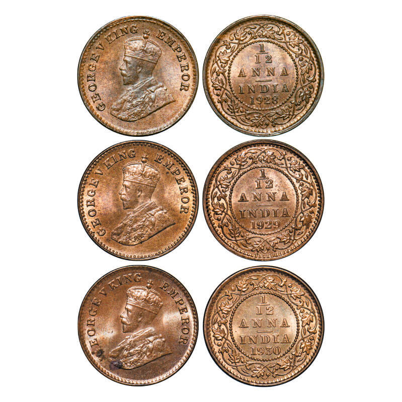 | George V, Bronze, 1/12 Anna, (3 coins), 1928, 1929, 1930, Calcutta Mint, No dot. GK 1244, 1245, 1246. Mint State. Scarce as a lot. |