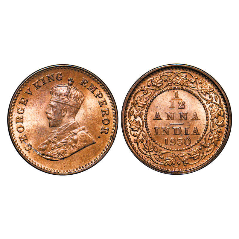 George V, Bronze, 1/12 Anna, 1930, Calcutta Mint, No dot, Error: Struck through Error on Obv. GK 1246. Uncirculated. Scarce.