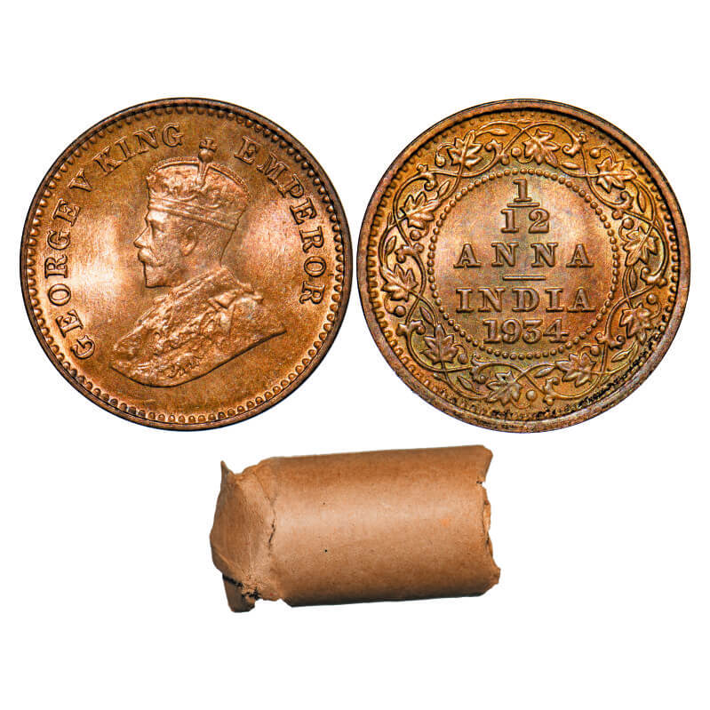 George V, Bronze, 1/12 Anna, 1934, Calcutta Mint, No dot. 24 Uncirculated coins in a brown paper roll. GK 1250. Scarce.