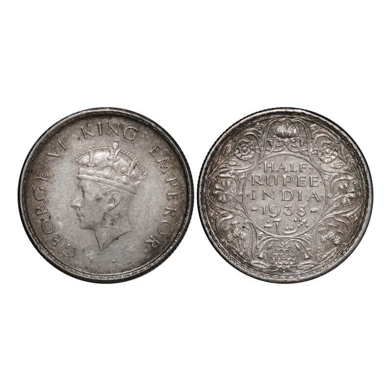| George VI, Silver, Half Rupee, 1938, Bombay Mint, A/I, Dot, Milled edge, Head Type I, Tiny diamond shape mark on Obv and Rev. GK 1294. about Uncirculated. Scarce. |