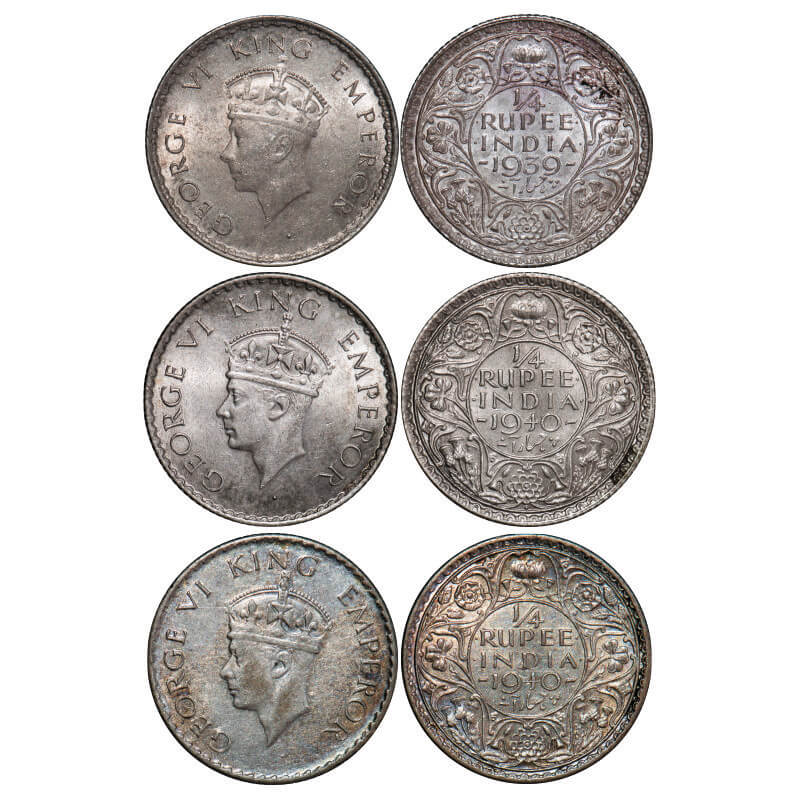 | George VI, Half Silver, 1/4 Rupee, (3 coins), 1) 1939, Silver, Bombay Mint, Head Type I, Rev I, Dot, Milled edge, 2) 1940, Bombay Mint, Head Type II, Rev I, Dot, Milled edge, 3) 1940, Calcutta Mint, Head Type II, Rev I, No dot, Milled edge. GK 1323, 1327, 1328. Extremely Fine to Extremely Fine+. Scarce as a lot. |