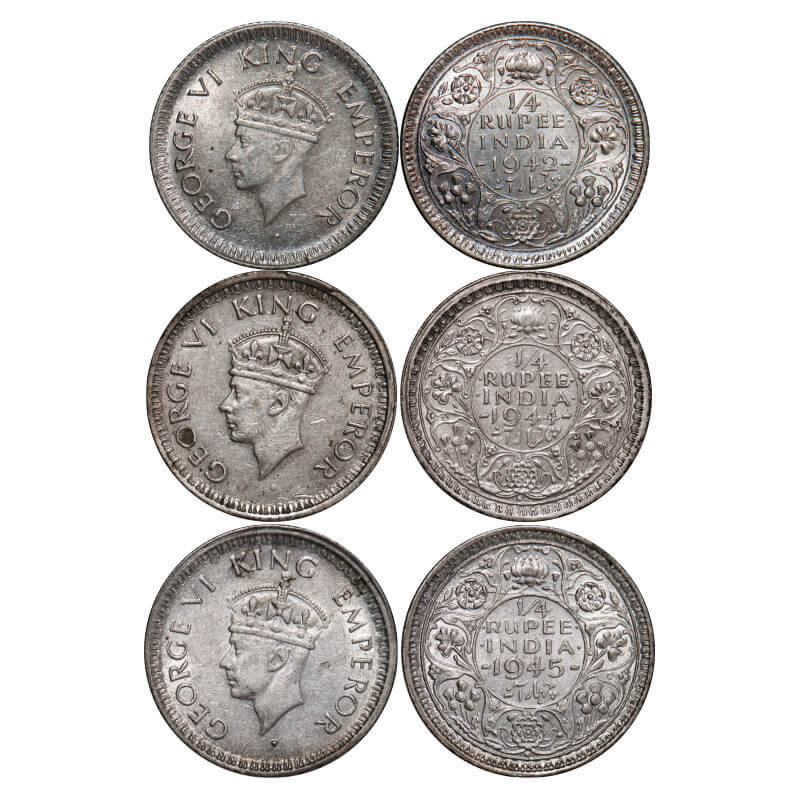 | George VI, Half Silver, 1/4 Rupee, (3 coins), 1) 1942, Calcutta Mint, Head Type II, Rev II, No dot, Milled edge, 2) 1944, Bombay Mint, Head Type II, Rev III, Diamond, Security edge, 3) 1945, Bombay Mint, Head Type II, Rev II, Dot, Security edge. GK 1329, 1337, 1341. Extremely Fine to Uncirculated. Scarce. |