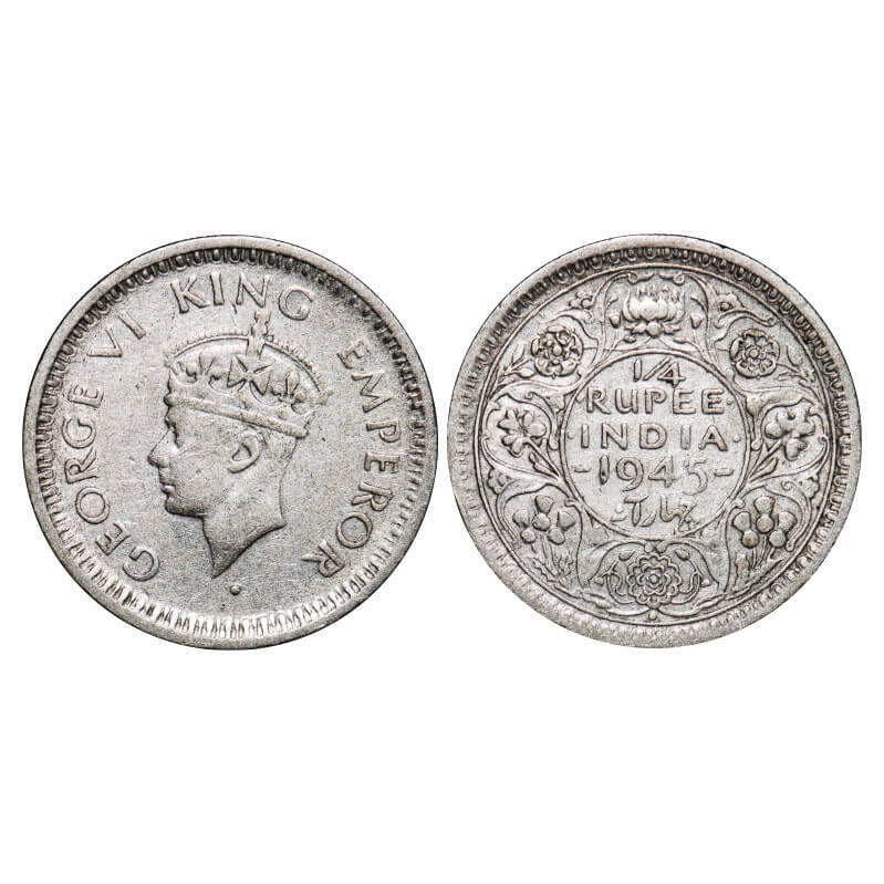 | George VI, Half Silver, 1/4 Rupee, 1945, Bombay Mint, Head Type II, Rev II, Dot, Security edge, Large 5. GK 1343. Very Fine+, Cleaned. Scarce. |
