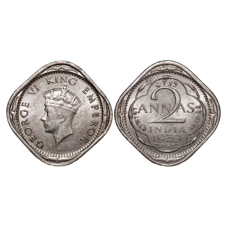 George VI, Copper-Nickel, 2 Annas, (2 coins), 1939, Head Type II, 1) Bombay Mint, Dots by year, 2) ...