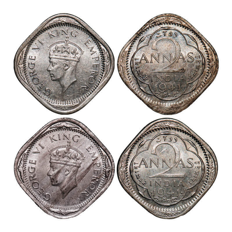 | George VI, Copper-Nickel, 2 Annas, (2 coins), 1941, Head Type II, 1) Bombay Mint, Dots by year, Tiny diamond shape pyramis on Obv, 2) Calcutta Mint, No dots by year. GK 1355, 1357. Brilliant Uncirculated to Mint State. Scarce. |