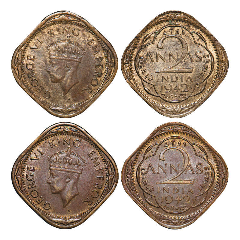 | George VI, Nickel-Brass, 2 Annas, (2 coins), 1942, Bombay Mint, Head Type II, Dots by year, Small numeral 4, 1) Die crack on Rev, 2) Planchet flaw on Obv and Rev. GK 1358(2). Extremely Fine to Extremely Fine+. Scarce. |