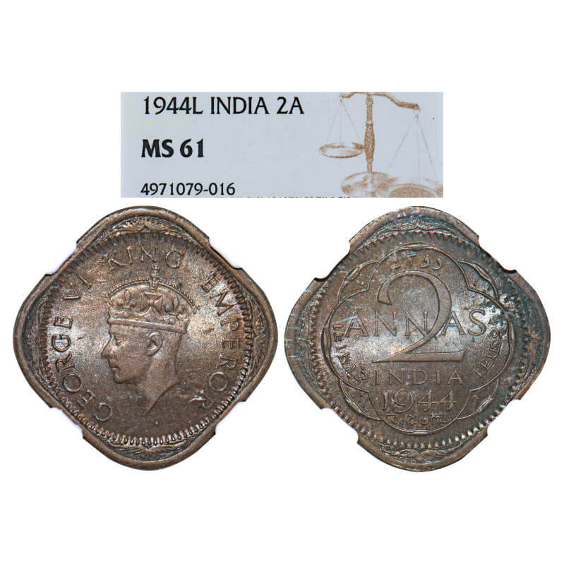 | George VI, Nickel-Brass, 2 Annas, 1944, Lahore Mint, Head Type II, No dots by year, 'L' raised Four times in the quatrefoil angles, Large numerals 44. GK 1366. NGC Slabbed MS 61. Rare. |
