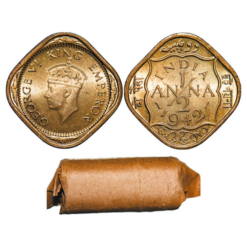 George VI, Nickel-Brass, 1/2 Anna, 1942, Bombay Mint, No dots by India, Dashes by year. 24 Uncirculated coins in a Brown paper roll. GK 1404. Scarce.