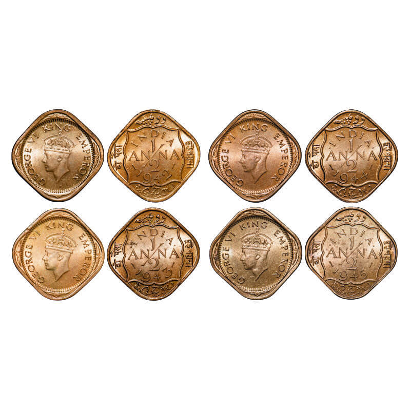 | George VI, Nickel-Brass, 1/2 Anna, (4 coins), 1) 1942, Bombay Mint, No dots by India, Dashes by year, 2) ,3) & 4) 1943, 1944, 1945, Calcutta Mint, Dots by India, Dashes by year. GK 1404, 1407, 1408, 1409. Mint state. Very Scarce as a lot. |
