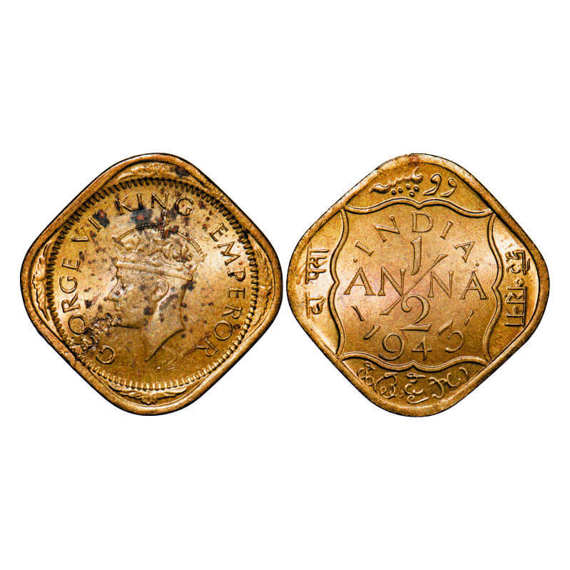 | George VI, Nickel-Brass, 1/2 Anna, 1943, Calcutta Mint, Dots by India, Dashes by year, Planchet flaw on Obv. GK 1407. Uncirculated, Details. Scarce. |