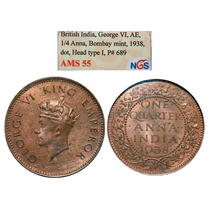 George VI, Bronze, Quarter Anna, 1938, Bombay Mint, Dot, Head Type I, Dots by One, Small year numerals with more space inbetween. GK 1419. NGS Slabbed AMS 55. Very Scarce.