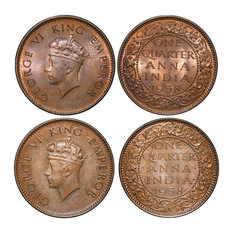 | George VI, Bronze, Quarter Anna, (2 coins), 1938, 1) Bombay Mint, Head Type I, Dot, Dots by One, Small year numerals with more space inbetween, 2) Calcutta Mint, Head Type I, No dot. GK 1419, 1421. Brilliant Uncirculated to mint State. Very Scarce. |
