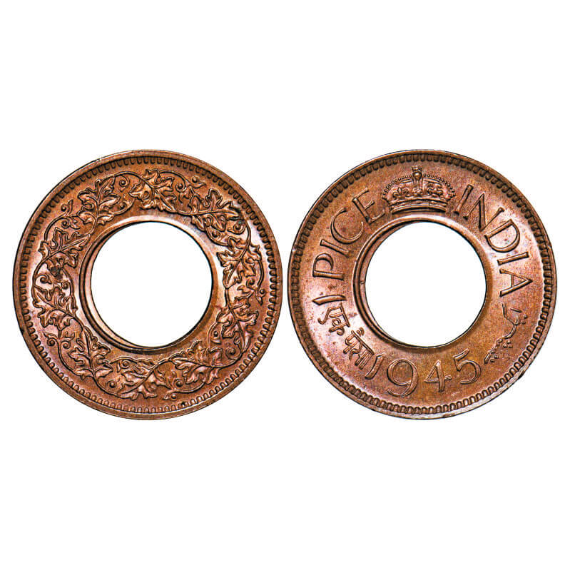 | George VI, Bronze, Pice, 1945, Calcutta Mint, Flat Crown, No mint mark, Die doubling of Urdu year, Year date and Nagari legends on Obv, mis aligned die in the center hole. GK 1445. Uncirculated. Scarce. |