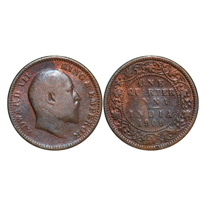 Edward VII, Bronze, Quarter Anna, 1909, Calcutta Mint, No mint mark. GK 1001. Very Fine. Scarce.