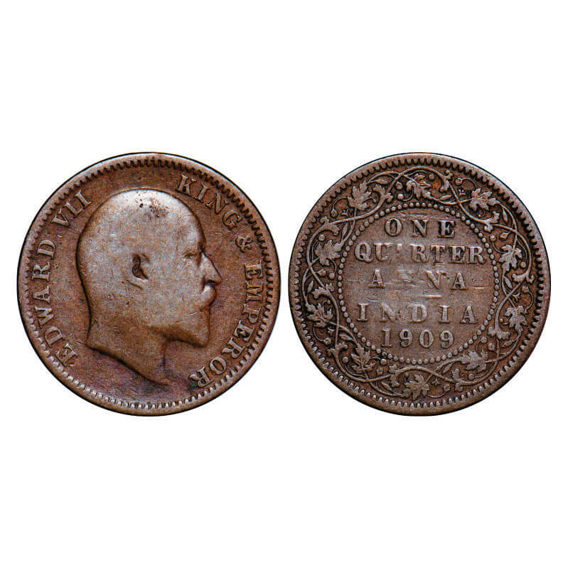 Edward VII, Bronze, Quarter Anna, 1909, Calcutta Mint, No mint mark. GK 1001. Very Fine. Scarce.