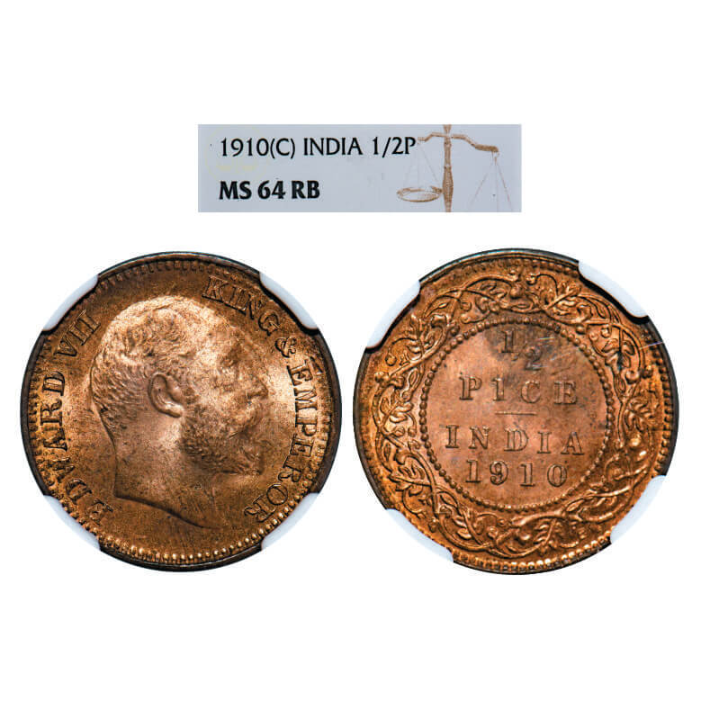 Edward VII, Bronze, 1/2 Pice, 1910, Calcutta Mint, No mint mark. GK 1011. NGC Slabbed MS 64 RB. Rare.