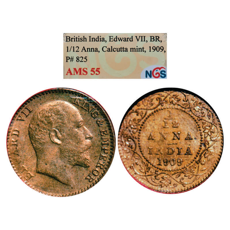 Edward VII, Bronze, 1/12 Anna, 1909, Calcutta Mint, No mint mark. GK 1019. NGS Slabbed AMS 55. Scarce.