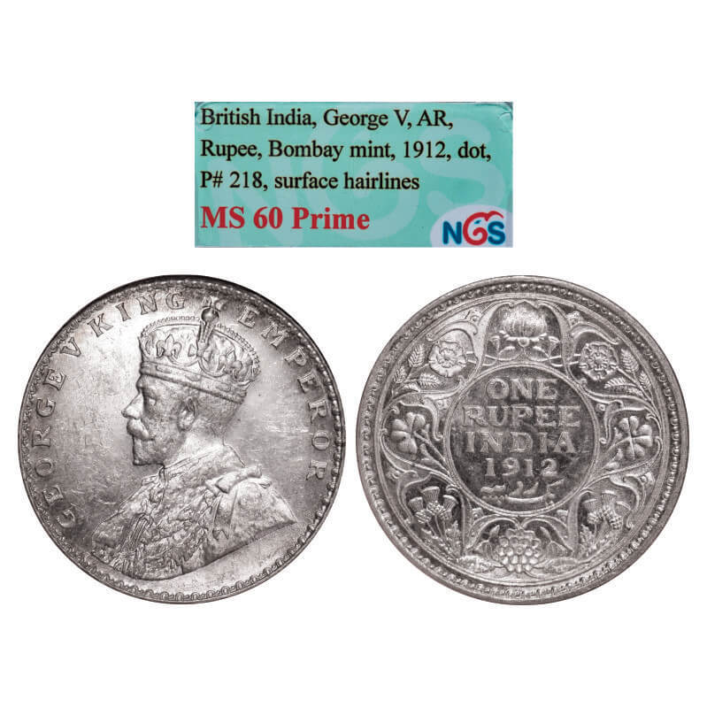 George V, Silver, Rupee, 1912, Calcuta Mint, No dot, Re-drawn Elephant with long tusks. GK 1023. NGS Slabbed MS 60 Prime. Scarce.
