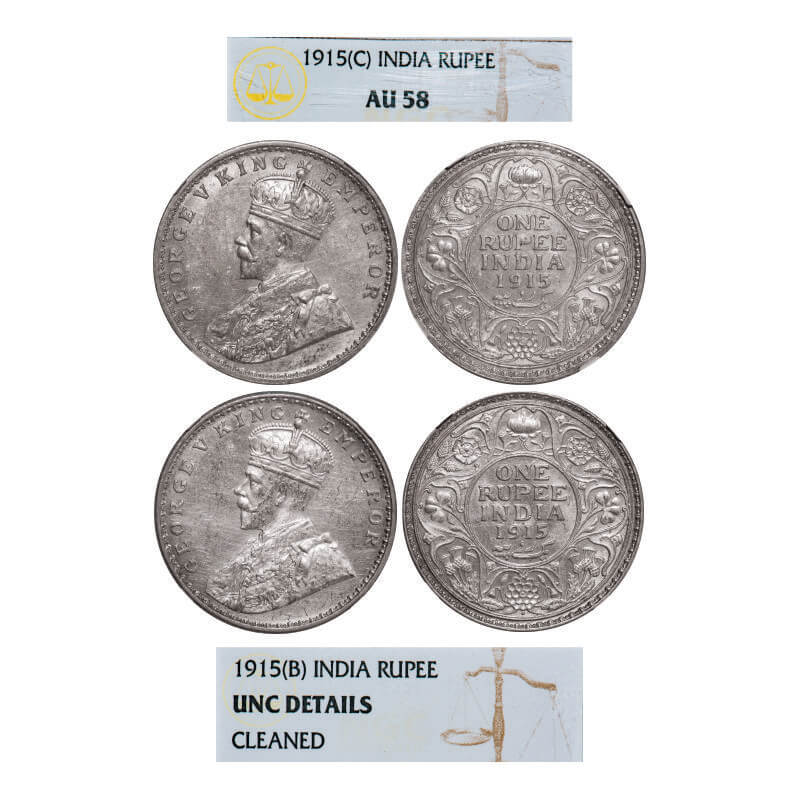 | George V, Silver, Rupee, (2 slabs), 1915, 1) Calcutta Mint, No dot, 2) Bombay Mint, Dot. GK 1031, 1032. NGC Slabbed AU 58, UNC Details. Very Scarce. |