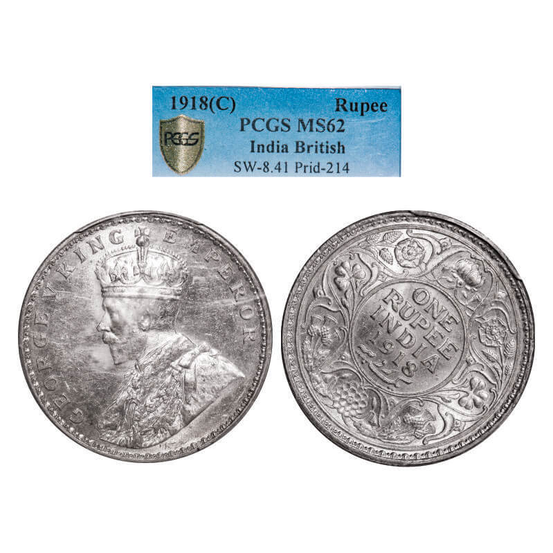 George V, Silver, Rupee, 1918, Calcutta Mint, No dot, 1 o'clock die rotation on Rev, Raised initials 'B' & 'M' on the truncation of Kings shoulder indicating engraver's name Sir Edger Bertram MacKennal. GK 1037. PCGS Slabbed MS 62. Very Scarce.