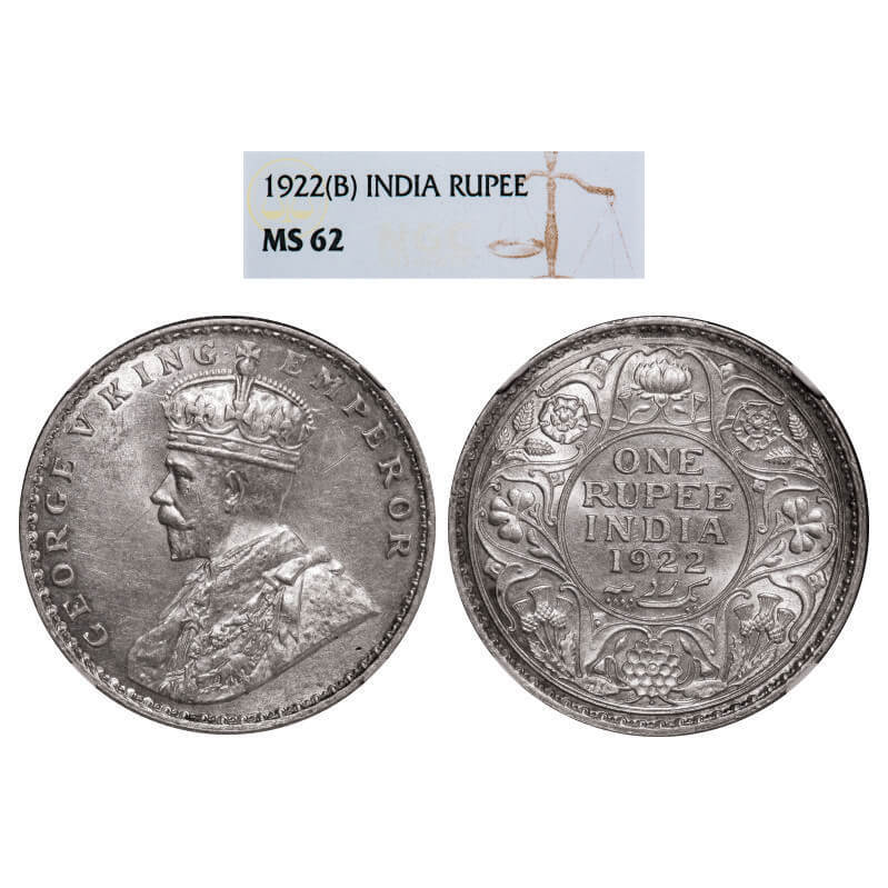 George V, Silver, Rupee, 1922, Bombay Mint, Dot, Raised initials 'B' & 'M' on the truncation of Kings shoulder indicating engraver's name Sir Edger Bertram MacKennal. GK 1044. NGC Slabbed MS 62. Very Rare.