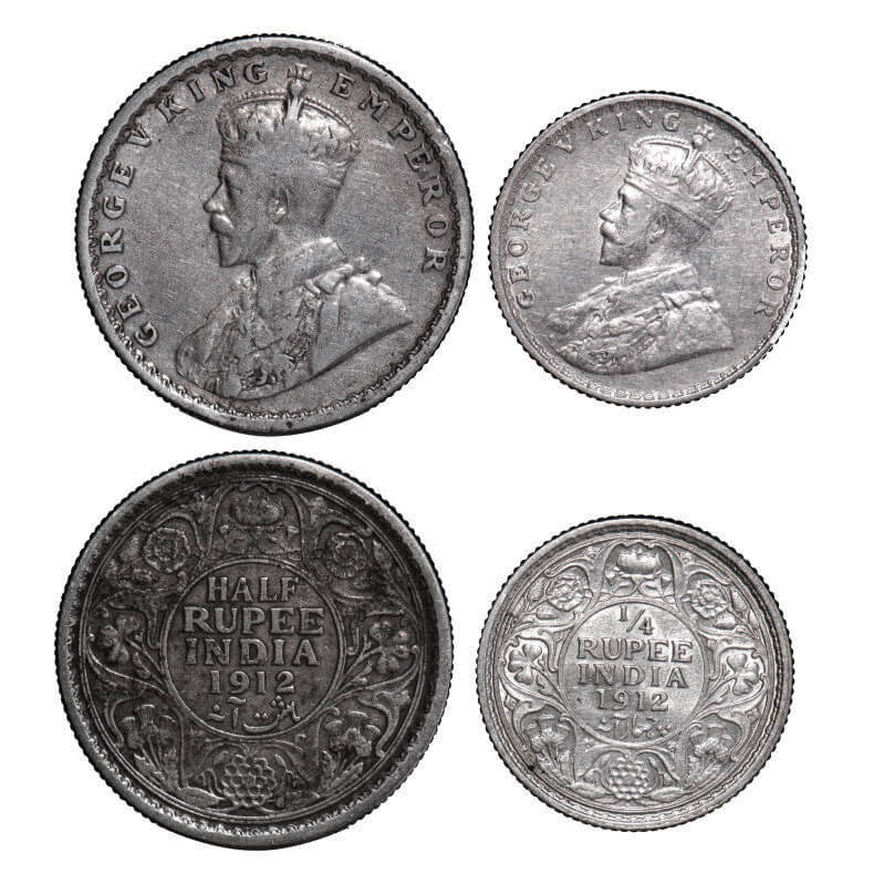 | George V, Silver, Half Rupee & 1/4 Rupee, 1912, 1) Calcutta Mint, No dot, Re-drwan elephant, 2) Bombay Mint, Dot. GK 1046, 1082. Fine+ to About Uncirculated. Scarce. |