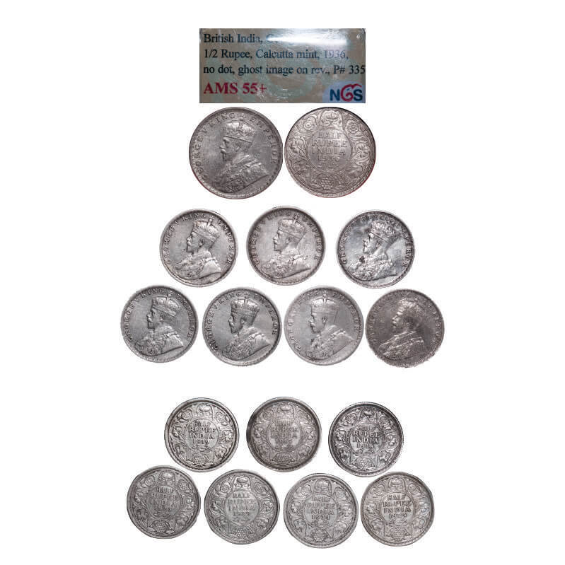 | George V, Silver, Half Rupee, (lot of 7 coins & 1 slab), 1917, 1918, 1919, 1923, 1924, Bombay Mint, Dot, 1929, 1934, 1936, Calcutta Mint, No dot. GK 1055, 1056, 1057, 1062, 1064, 1071, 1074, 1075. Extremely Fine to NGS Slabbed AMS 55+. Scarce as a lot. |