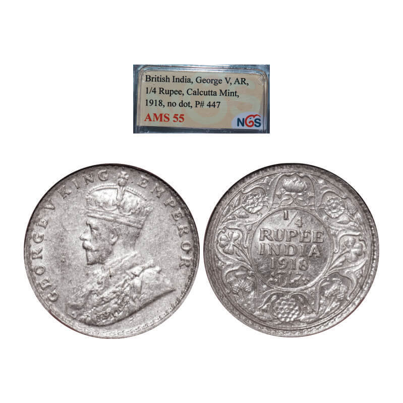 George V, Silver, 1/4 Rupee, 1918, Calcutta Mint, No dot. GK 1091. NGS Slabbed AMS 55. Very Scarce.