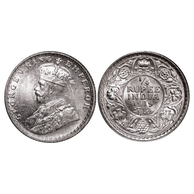 George V, Silver, 1/4 Rupee, 1919, Calcutta Mint, No dot, Ghost on Obv. GK 1092. Brilliant Uncirculated. Very scarce.