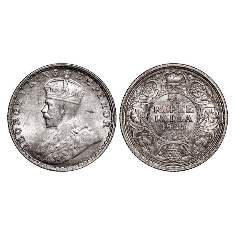 George V, Silver, 1/4 Rupee, (lot of 4 coins), 1) 1919, Calcutta mint, No dot, 2) 1925, Bombay Mint...