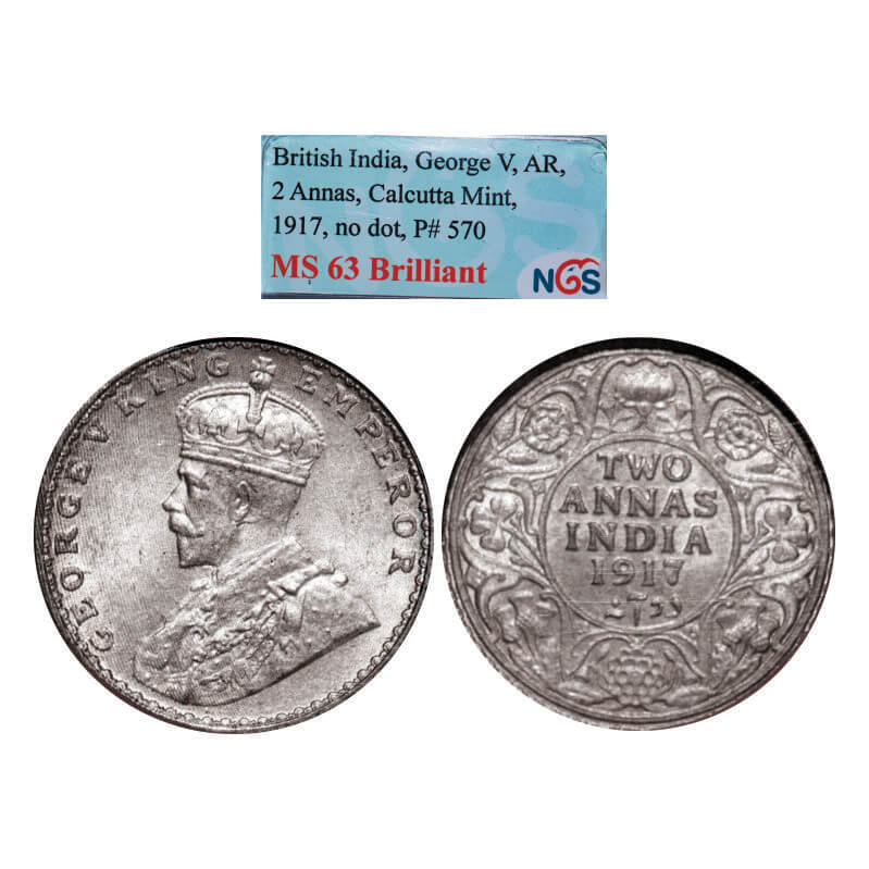 George V, Silver, 2 Annas, 1917, Calcutta Mint, No dot. GK 1117. NGS Slabbed MS 63 Brilliant. Very Scarce.