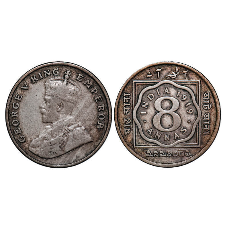 George V, Copper-Nickel, 8 Annas, 1919, Calcutta Mint, No dot. GK 1077. Very Fine+. Scarce.