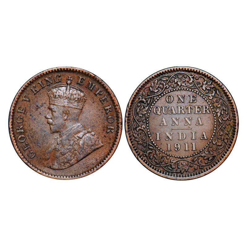 George V, Bronze, Quarter Anna, 1911, Calcutta mint, No dot, Pig-Type. GK 1171. About Uncirculated. Scarce.