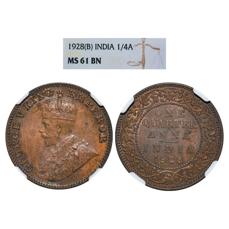 George V, Bronze, Quarter Anna, 1928, Bombay Mint, Dot. GK 1187. NGC Slabbed MS 61 BN. Very Scarce.