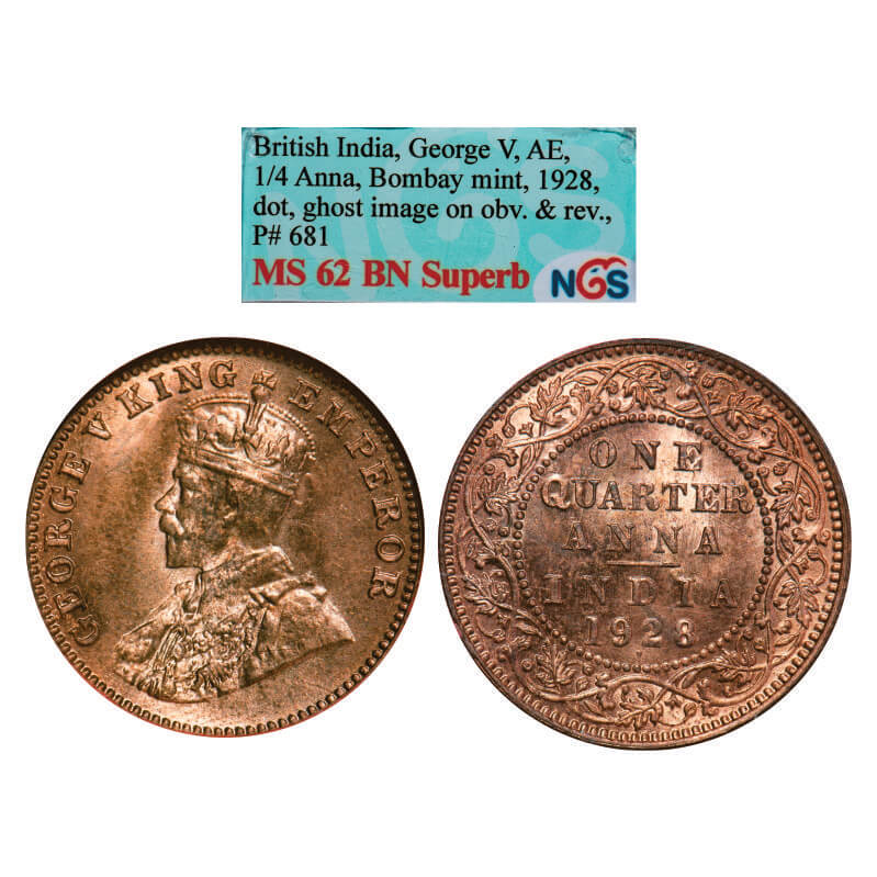 George V, Bronze, Quarter Anna, 1928, Bombay Mint, Dot, Ghost on Obv and Rev mentioned on the slab. GK 1187. NGS Slabbed MS 62 BN Superb. Very Scarce.