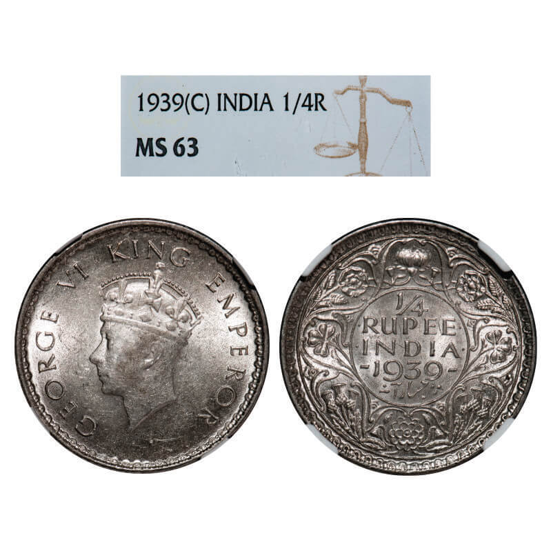 | George VI, Silver, 1/4 Rupee, 1939, Calcutta Mint, Head Type I, Rev I, No dot, Milled edge. GK 1325, F. Prid 472. NGC Slabbed MS 63. Rare. |
