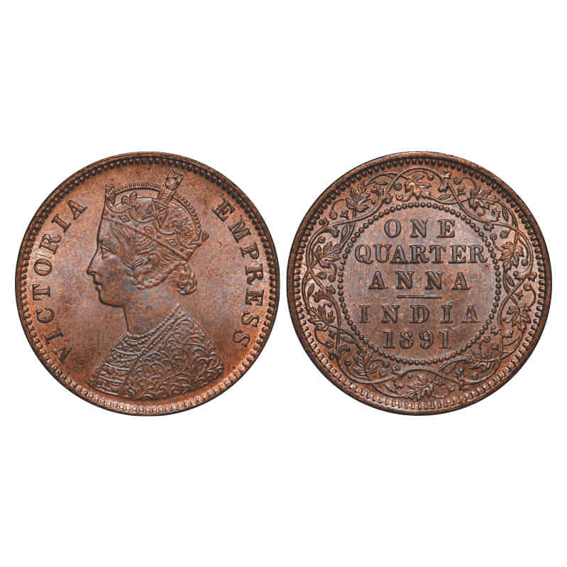 Victoria Empress, Copper, Quarter Anna, 1891, Calcutta Mint, B/II, No mint mark. F. Prid # 624. GK 850. Uncirculated. Scarce.