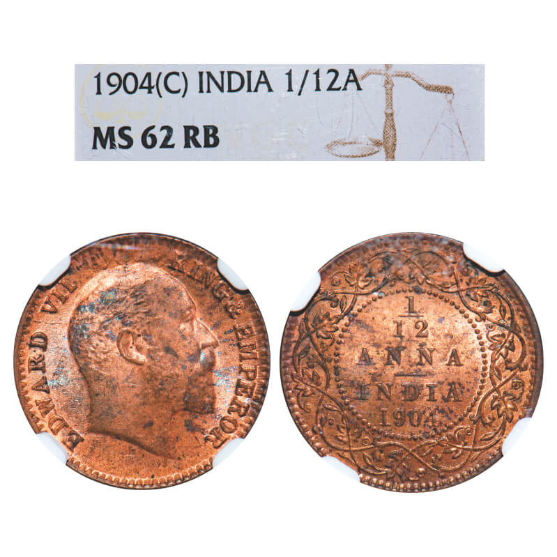 Edward VII, Copper, 1/12 Anna, 1904, Calcutta Mint, No mint mark. F. Prid 647. GK 995. NGC Slabbed MS 62 RB. Rare.