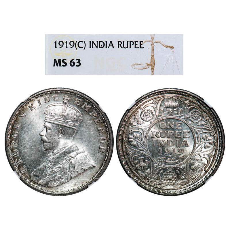 George V, Silver, Rupee, 1919, Calcutta Mint, No dot. F. Prid 215. GK 1039. NGC Slabbed MS 63. Very Scarce.