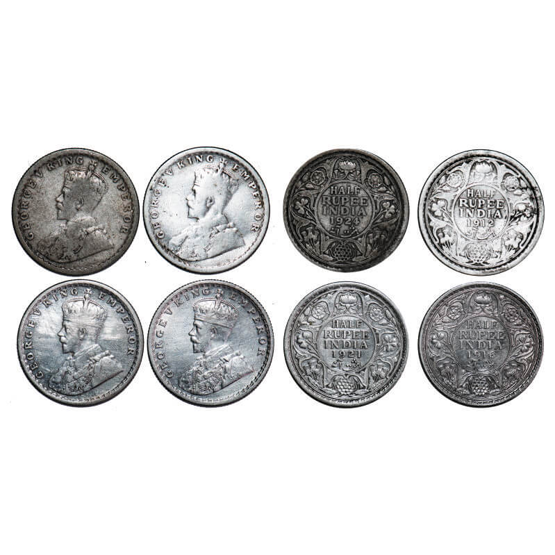 | George V, Silver, Hlaf rupee, (4 coins), 1912, 1916, 1921, 1924, Calcutta Mint, No dot. F. Prid 319, 323, 324, 327. GK 1046, 1053, 1058, 1063. Fine to Extremely Fine+. Scarce. |