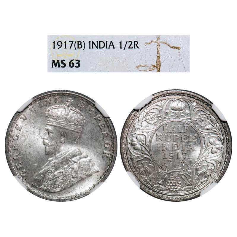 George V, Silver, Half Rupee, 1917, Bombay Mint, Dot, Elephant. F. Prid 341. GK 1055. NGC Slabbed MS 63. Rare.