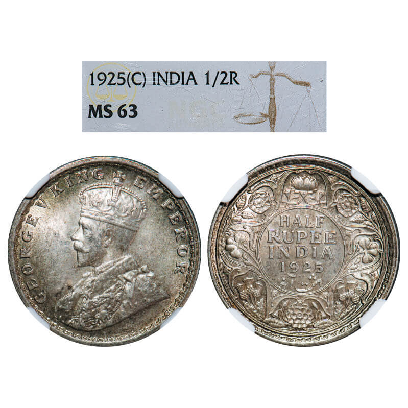 George V, Silver, Half Rupee, 1925, Calcutta Mint, No dot. F. Prid 328. GK 1065. NGC Slabbed MS 63. Rare.