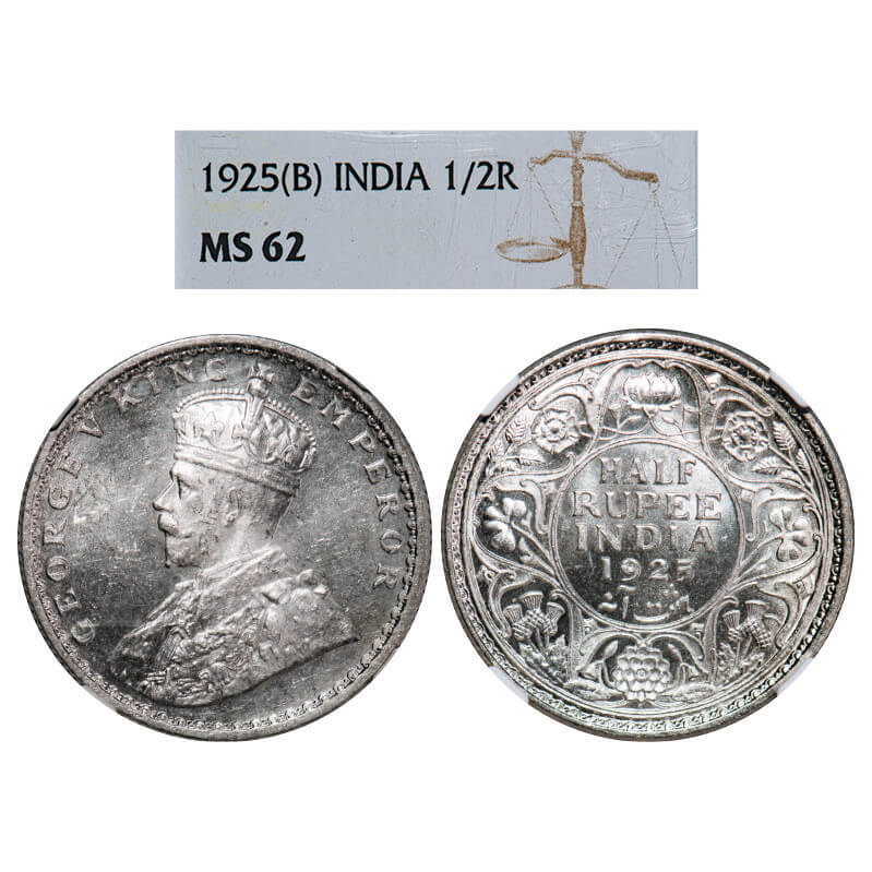 George V, Silver, Half Rupee, 1925, Bombay Mint, Dot. F. Prid 347. GK 1066. NGC Slabbed MS 62. Very Rare.