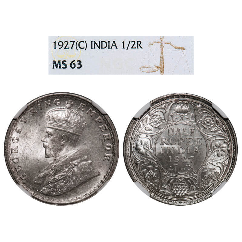 George V, Silver, Half Rupee, 1927, Calcutta Mint, No dot. F. Prid 330. GK 1069. NGC Slabbed MS 63. Very Rare.