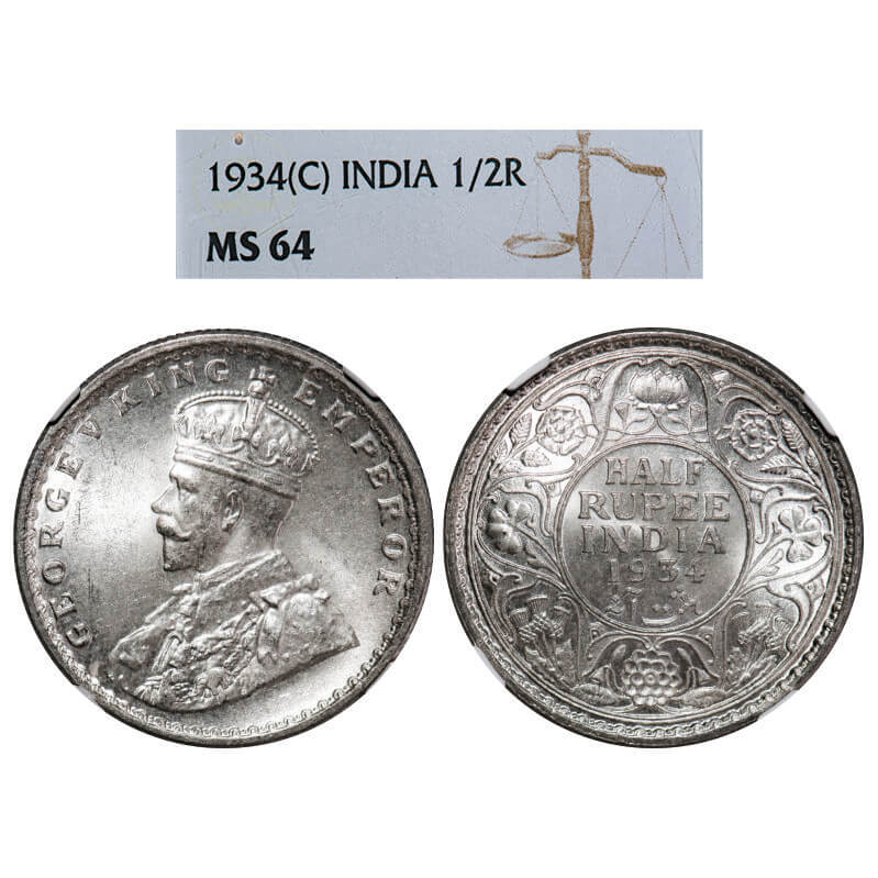 George V, Silver, Half Rupee, 1934, Calcutta Mint, No dot, Elephant. F. Prid 334. GK 1074. NGC Slabbed MS 64. Very Rare.