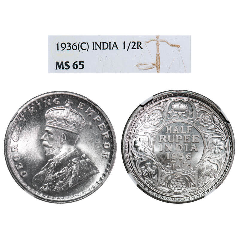 George V, Silver, Half Rupee, 1936, Calcutta Mint, No dot, Elephant. F. Prid 335. GK 1075. NGC Slabbed MS 65. Very Rare.