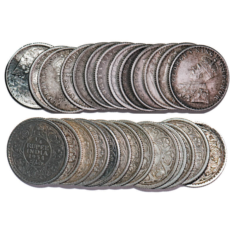 | George V, Silver, 1/4 Rupee, (lot of 13 coins), 1912, 1916, 1917, 1926, 1929, 1930, 1934, 1936, Calcutta Mint, No dot. 1913, 1914, 1915, 1925, 1928, Bombay Mint Dot. F. Prid 441, 445, 446, 450, 451, 452, 453, 455, 456, 457, 458, 459. GK 1081, 1089, 1090, 1094, 1096, 1097, 1098, 1099, 1084, 1086, 1088, 1093, 1095. Very FIne to Extremely Fine+. Scarce as a lot |