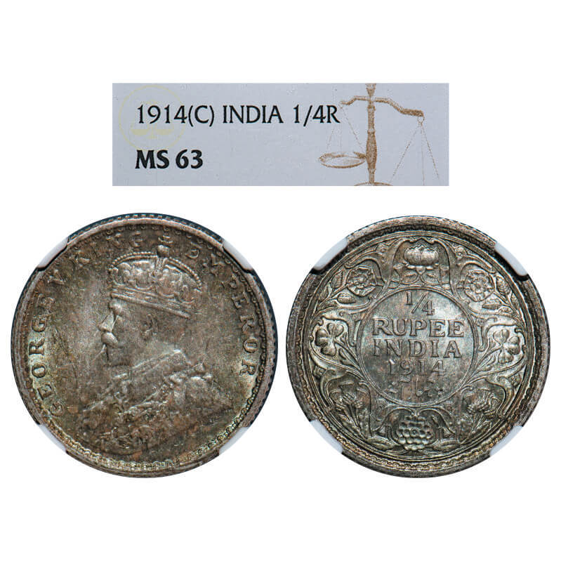 George V, Silver, 1/4 Rupee, 1914, Calcutta Mint, No dot. F. Prid 443. GK 1085. NGC Slabbed MS 63. Rare.