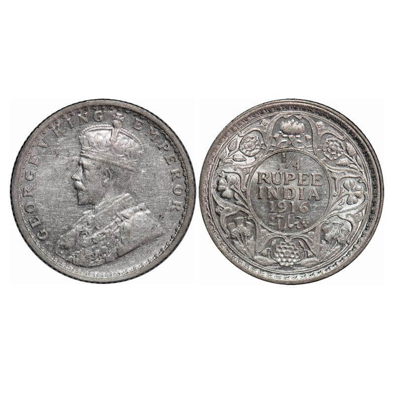 George V, Silver, 1/4 Rupee, 1916, Calcutta Mint, No dot. F. Prid 445. GK 1089. Brilliant Uncirculated. Very Scarce.