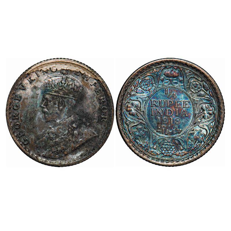 George V, Silver, 1/4 Rupee, 1918, Calcutta Mint, No dot. F. Prid 447. GK 1091. Brilliant Uncirculated, Rainbow Toned. Very Scarce.